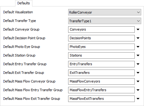 You'll notice there are two fields with pull-down menus. From each pull-down menu you can select the default types that are assigned to various conveyor objects when they are first added to the simulation model.