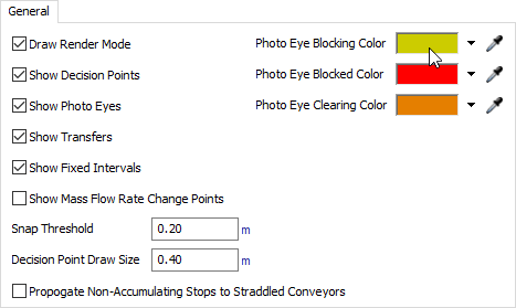 When checked, photo eyes will appear as a green or red line across a conveyor.
