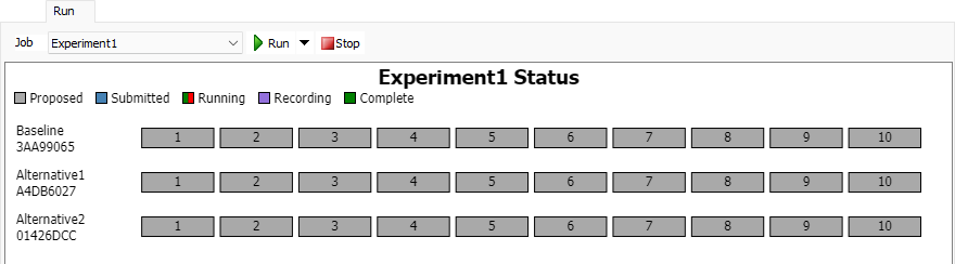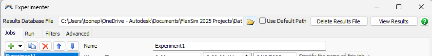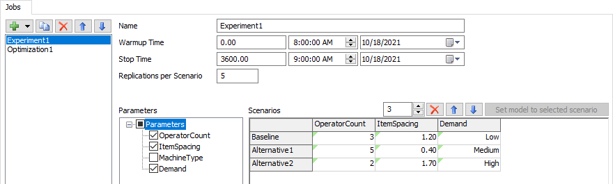 The Experimenter is a tool that automates running a model with different inputs and collecting the results. To use the Experimenter, you'll configure one or more Jobs. A Job defines a strategy for generating Scenarios (a set of model inputs) and for determining how many Replications of each Scenario to run. When a Job runs, it runs the model once for each Replication of each Scenario, and records the results in a Results Database File. You can then view and explore the results in the Performance Measures Window.