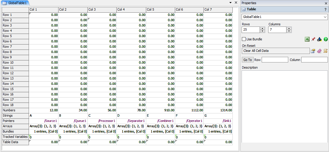 Global Tables can store numbers, strings, pointers, arrays, FlexScript, bundles or tracked variables. This data can be accessed by any object in the model using the Table class interface. A model may have any number of Global Tables.