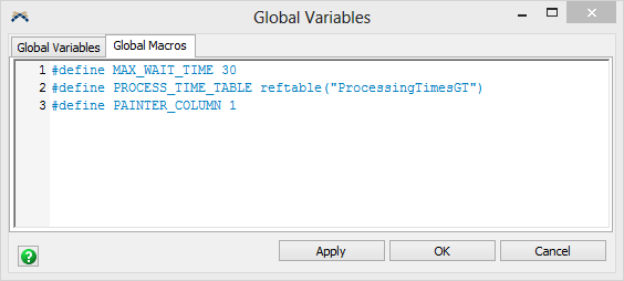 The Global Variables window lets you create global variables and macro definitions that are accessible in FlexScript and C++. Once a variable has been created, you can get and set the value of that variable in a Code Editor window or Script Console.