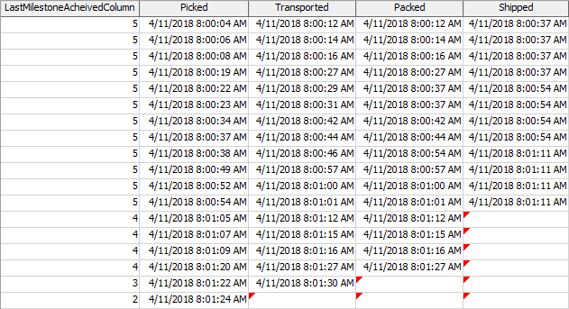 In the above table, there is one row per flowitem. You can see the times that each item reached each milestone. The rows closer to the end have null values in some of the columns, indicating that the item for that row has not yet reached those milestones.