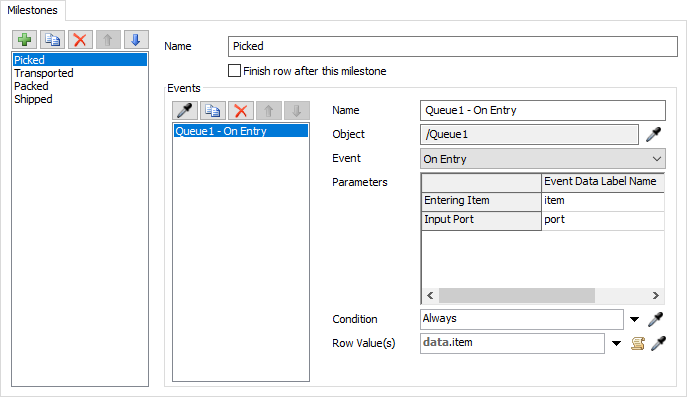 In FlexSim, a milestone is an ordinary event that is important statistically. For example you might be interested in the time it takes for a flowitem to travel between two parts of a facility. That time span is defined by two times: the time that the flowitem begins travelling, and the time that the flowitem ends travelling. You can create a milestone for each of those events in a Milestone Collector. The milestone collector will then record when each of those events happen for every flowitem, allowing you to gather statistics on those two events. For example, you could determine how the average, maximum, and minimum times between the two milestones.