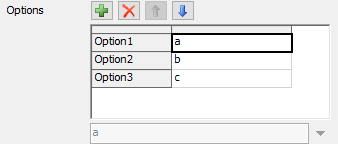 Visible for Option types. Option type values require you to enumerate the set of possible values for this value. Each possiblity is called an option. Each option has a name and a value. The value can be a number, text, or a FlexScript expression. The name is arbitrary.