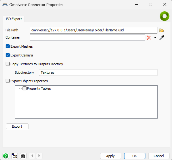 The Omniverse Connector is used to export Universal Scene Description (USD) files.