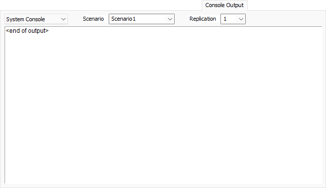 The Console Ouput Tab allows you to view any messages printed to the System or Output Consoles for every Scenario and Replication. It has the following properties: