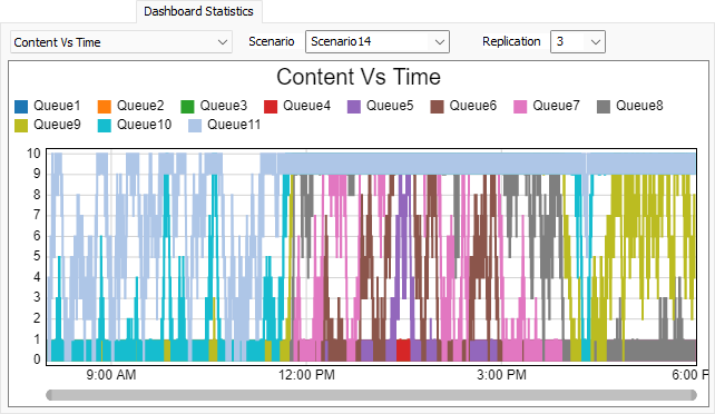 The Dashboard Statistics Tab allows you to view any dashboard chart for any Replication of any Scenario. Dashboard Statistics are only available if the Save charts and output tables for each replication box is checked before running a Job. This tab has the following properties: