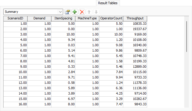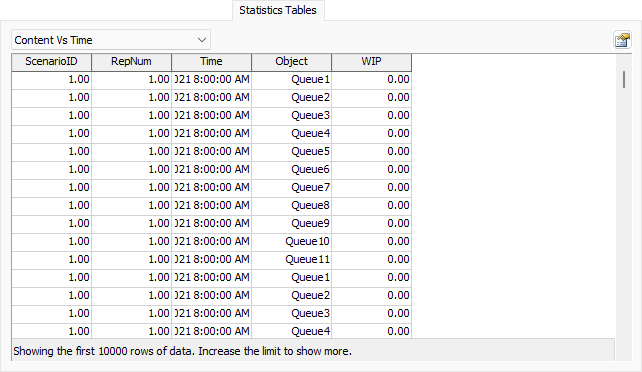 The Statistics Tables tab allows you to view each output table. Output tables include all Statistics Collectors and Calculated Tables in the model, even if those tables are part of a People Table or Chart Template. This tab allows you to see the data for all Scenarios and Replications of an output table as a single table. If you generate an Excel Workbook, that workbook will include one sheet per output table. Output tables are only available if the Save charts and output tables for each replication box is checked before running a Job. This tab has the following properties: