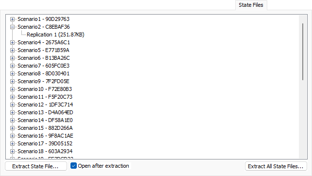 The State Files Tab shows any available State Files that have been saved, arranged by Scenario and Replication. State Files are only available if the Save state for each replication box is checked before a Job runs. This tab has the following properties: