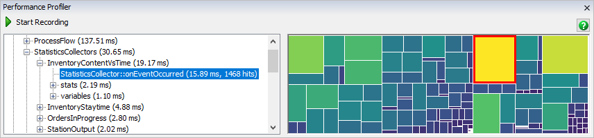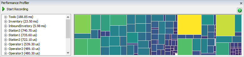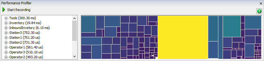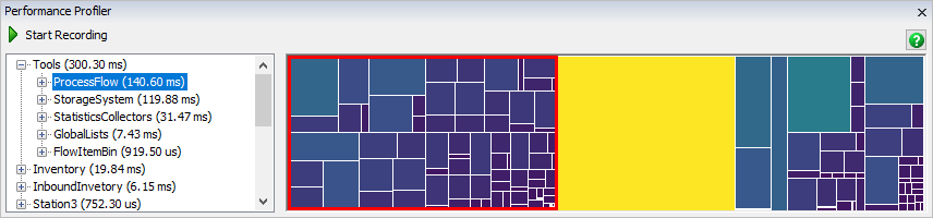 The Performance Profiler works by recording the time spent in certain FlexSim functions as the model runs. Once recording is finished, the Performance Profiler will present the data so that you can which of the profiled functions required the most time.