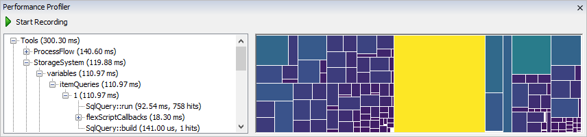 The second view in the Performance Profiler is the Performance Graph. This view draws each node as a box. Bigger boxes indicate that more CPU time was spent at a particular node, and smaller boxes indicate that less CPU time was spent at that node. The boxes are also colored by CPU time: the brightest, most yellow box corresponds to the node where the CPU spend the most time. The darkest, most purple box corresponds to the node where the CPU spent the least time.