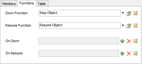 At the end of the down period's duration the set of resume functions are called. First, the Resume Function is fired. This happens once for each member of the Time Table. This allows you to resume the associated object, resume input on the object, etc. After all of the Resume Functions have fired, the On Resume function will fire once. The On Resume function passes in the list of members and the table row associated with the down time.