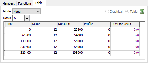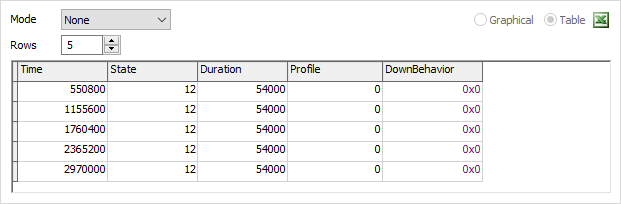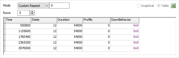 - Time - This is the time since the table began that the state change should occur. If the mode is set to None, the table does not repeat, so the times listed in the Time column are absolute.