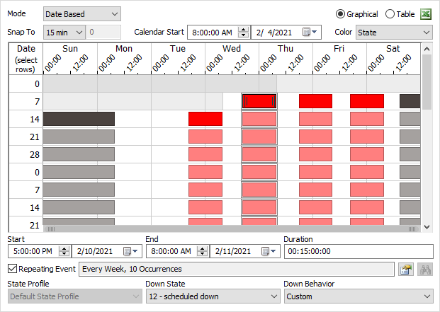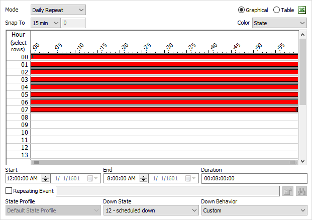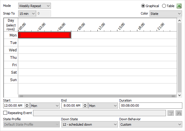 For convenience in working with down periods that wrap around the end of a day or week the Time Table will combine touching down periods that either set the same state and state profile or use the same down behavior. For example, in a weekly schedule, a down period that goes from Monday 10 PM to 12 AM will combine with a down period that goes from Tuesday 12 AM to 2 AM if the state / down behavior is the same.