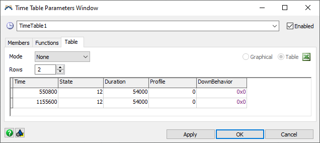 The main purpose of the Time Table object is to define scheduled periods of down-time for objects in the model. These down periods are defined by two numbers: a down time and a duration. The down period begins at the specified down time and will last for the specified duration in model time units. The functions on the Functions tab give you control over what happens to the objects listed in the Members tab at the beginning and end of each down period.