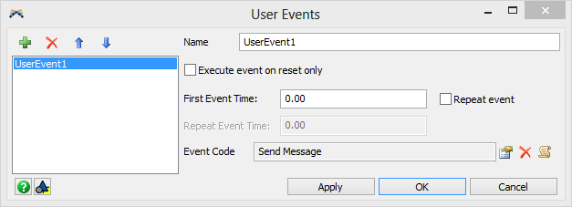 User Events are FlexScript functions that execute at set times during the model's run, but are not connected with any specific, visible object. They are created and stored in model's /Tools/UserEvents folder. A model can have any number of user events.