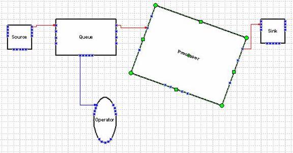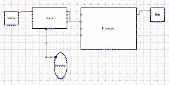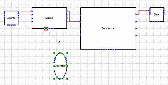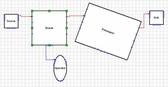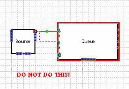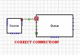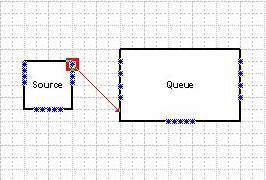 When dragging out a connection, it is acceptable to have both ends touching blue connection points. The connection will be created correctly. Also, the connection point that you connect them to in Visio does not matter. FlexSim connections will be ordered according to the order in which they were dragged out in Visio. The example below will connect queue to processor's first input port despite being connected to the second connection point on the object in Visio.