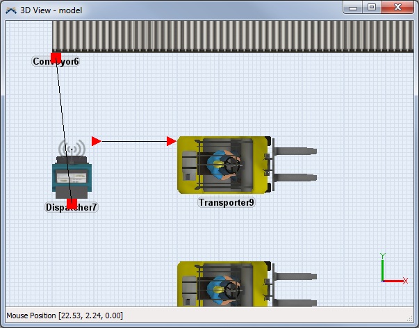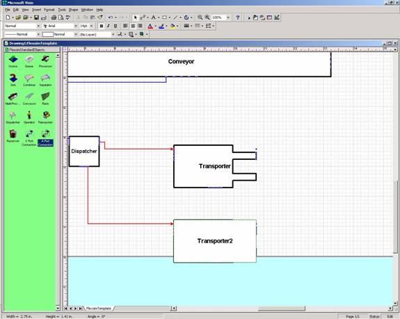Each object in your model must have a unique name in order for it to be correctly imported into FlexSim. If objects are given the same name in Visio, their connections will not be created correctly in FlexSim. In the example below, the Transporters have the same name, so the Dispatcher was connected to the first one twice.