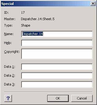 The Name field contains the object's class and a number separated by a period or just the object's class. If there is a number, it must match the ID number or the object will not be correctly exported. Typically the objects do this naturally, but sometimes Visio will incorrectly name an object in this field. If your model didn't correctly import into FlexSim, this was probably the reason why. The example below shows what happens if the name is left as "Dispatcher.14" instead of changed to "Dispatcher.17".