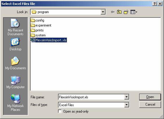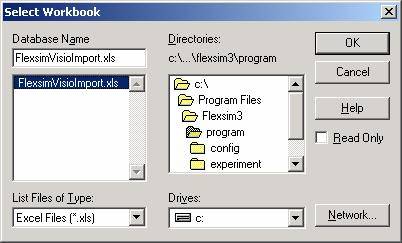 Select the excel file to export to. This should usually be C:/ProgramFiles/Flexsim3/program/FlexsimVisioImport.xls.