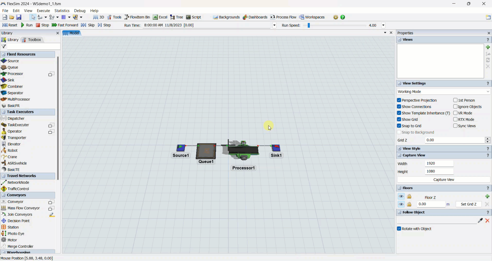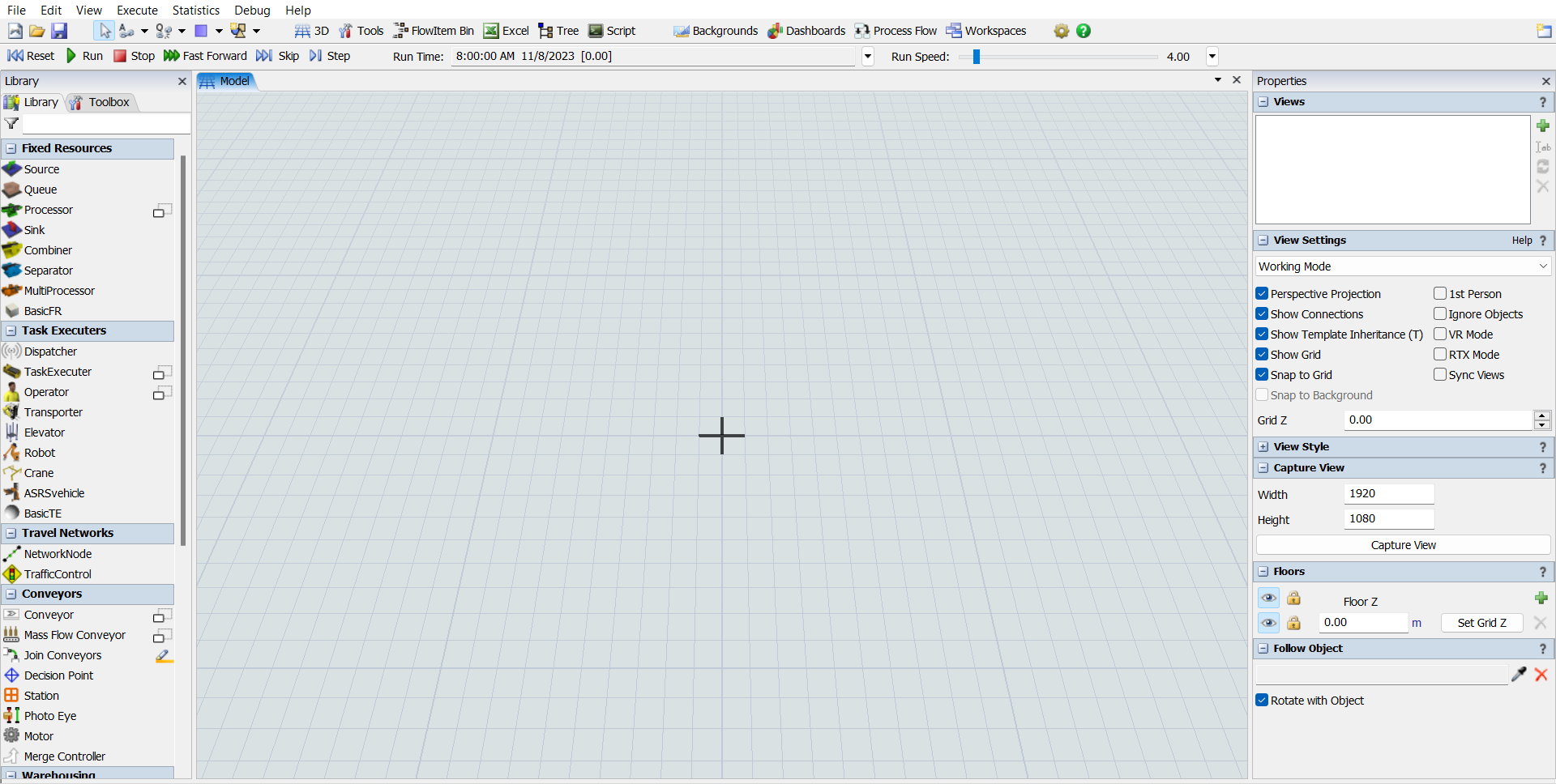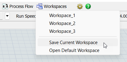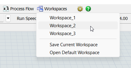 A Workspace is the arrangement of visible windows, panels, and tabs in FlexSim. The purpose of the Workspaces tool is to allow the user to save their preferred workspaces in a model, and toggle between them.