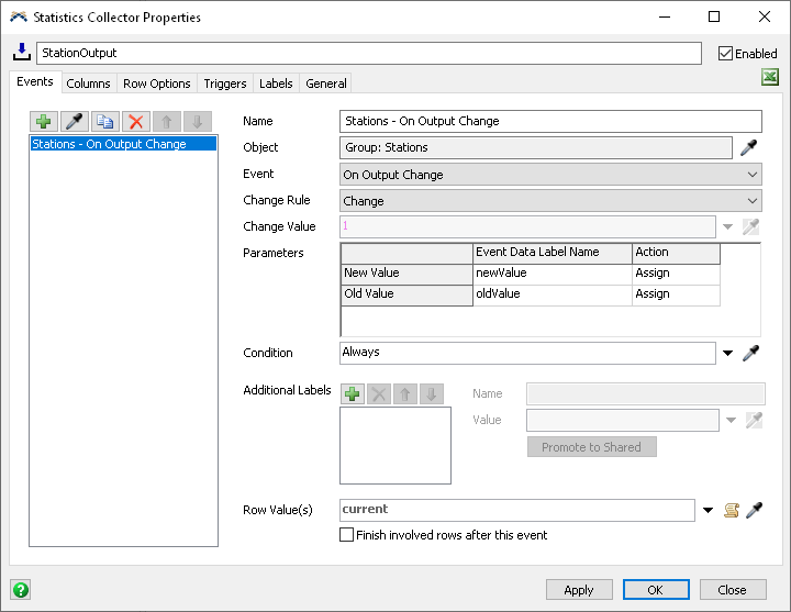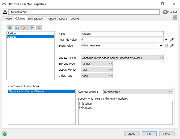 You can connect an event to one or more columns. When the event fires and yields its row value, then the statistics collector will make sure there is a row for that value. Then, for each connected column, the statistics collector will record the Event Value for that column on the current row. In this task, you connected the On Output Change event to the Output column. When a station's output changes, the statistics collector will make sure there is a row for that station, and then it will write the new output value in the Output column.