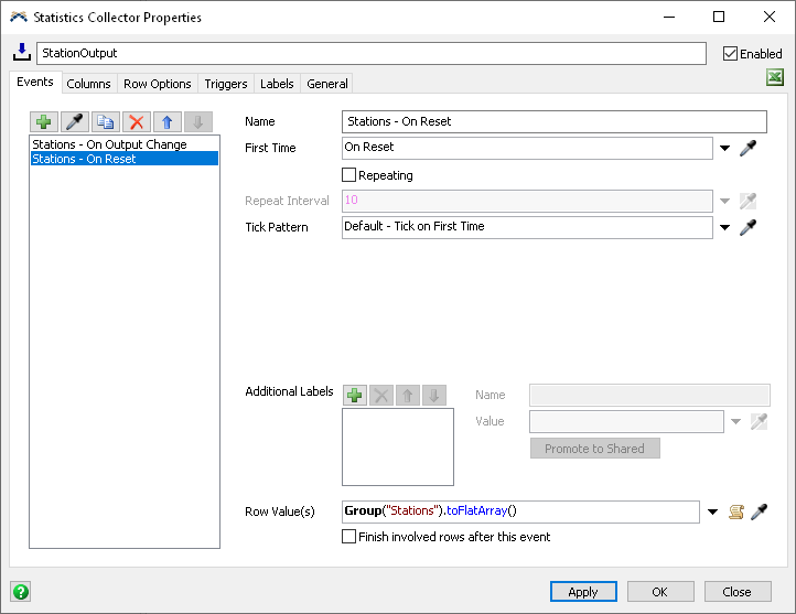 When the Stations - On Reset event fires, it yields an array containing all objects in the Stations group. These objects are in the order shown in the Group properties window. Later, when the Stations - On Output Change event fires, there is already a row for the station, so the Statistics Collector doesn't add a new row. However, that event is connected to the Output column, so the Output column on the station's row is updated.