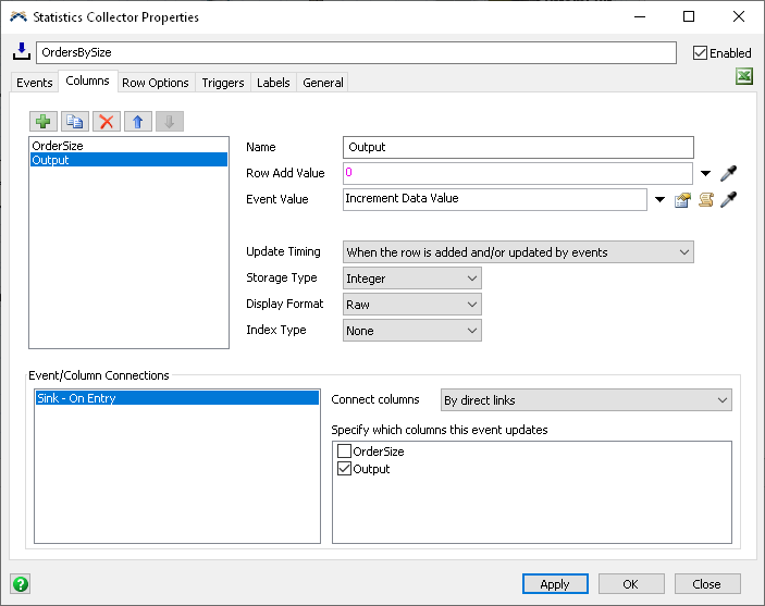 You may notice that the table is not ordered. The first row that comes in will be based on the first order that enters the system. If you want to order the table by order size, you can use the Row Sorting feature in the statistics collector properties. To do this: