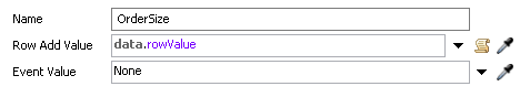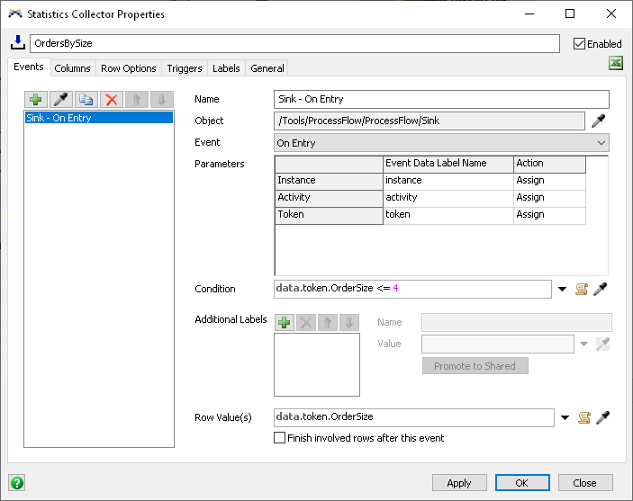 click on the Sink activity. From the menu that opens, select the On Entry event. - In the Row Value(s) field type data.token.OrderSize. This will use the previously mentioned OrderSize label on the token and create a unique row for each different size of order that comes through.