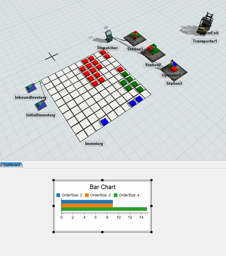 Now if you reset and run the model you will be able to see the chart utilizing the OrderBySize collector’s data during the runtime of the model.