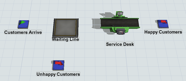 The first step in building a 3D model is to build the basic layout of the business system you're trying to simulate. The customer service center that you are modeling has a service desk with one or more customer service representatives. Customers who arrive generally line up near the window until they can be helped by an employee. In this simulation model, you'll also simulate customers who leave early if the wait is too long.