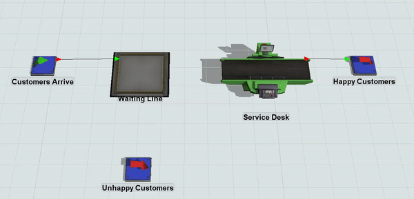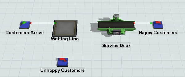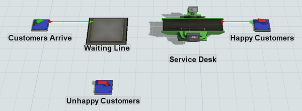 In this model, you'll create input/output port connections from the Customers Arrive source to the Waiting Line and from the Service Desk to the Happy Customers sink. You'll leave the other objects disconnected for now because you will connect those flows using a different tool later in the tutorial.