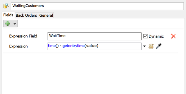 them to remove since they are unnecessary. - Now you'll change the name of the ageInQueue field to something more descriptive. Click the Expression Field box, delete the current text, and change its name to WaitTime.