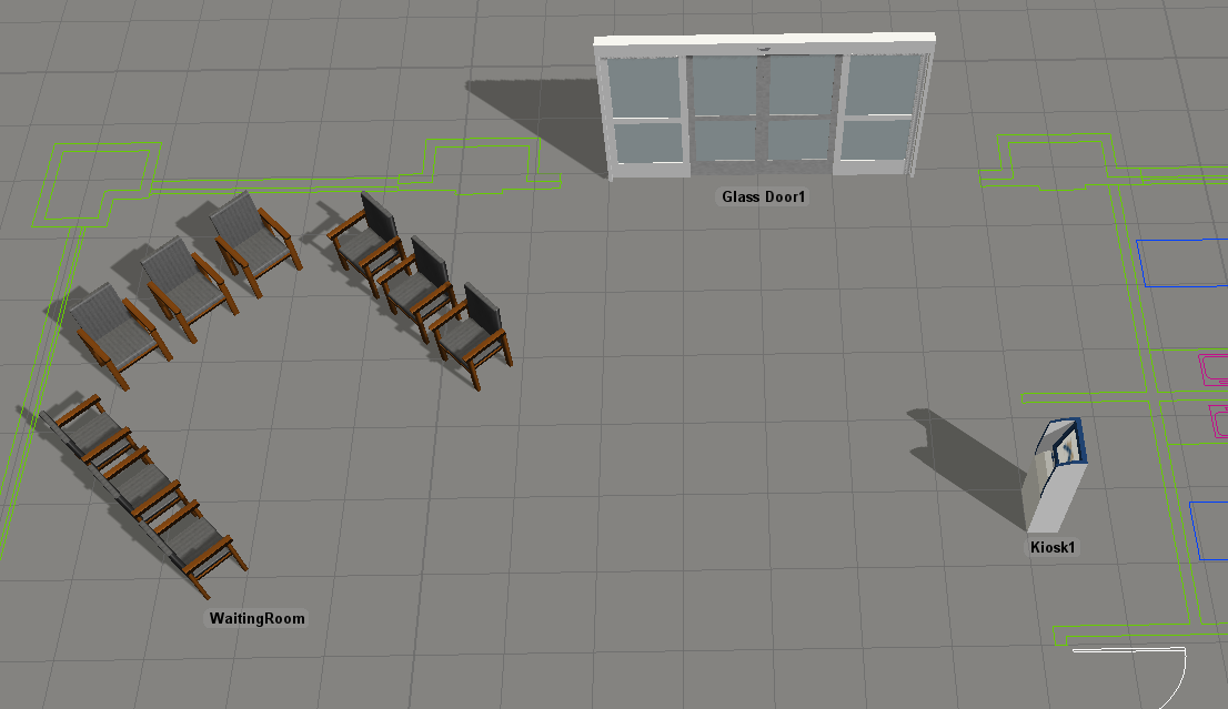 You'll also add a multi-location to your 3D model in this step. A multi-location is a location that contains a group of related locations. When a patient attempts to acquire the multi-location, any of the individual locations in this group could be acquired. In this model, you'll add a chairs multi-location to represent chairs in a waiting room area. Each individual chair can potentially be acquired by the patients, but you don't need to add each chair to the model; you can simply add the group of chairs.