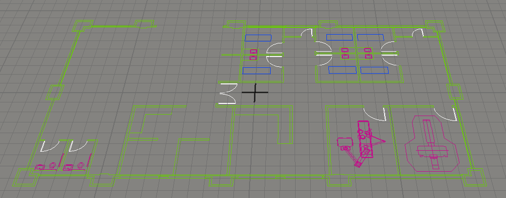 After switching to the Healthcare environment, you will add a floor plan of the clinic that you will simulate in this tutorial. This floor plan was included with FlexSim when you installed the software. When you're finished adding the floor plan, your model should look similar to the following image: