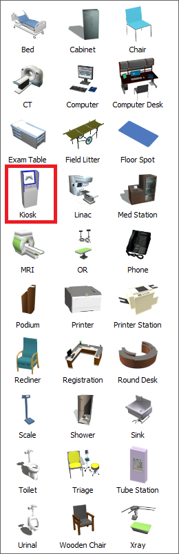 - Under the Healthcare group of objects, click the Location object to open a menu of location objects. Drag a Kiosk object into the 3D model. (Use the image at the beginning of this section as a guide for the placement of objects.)
