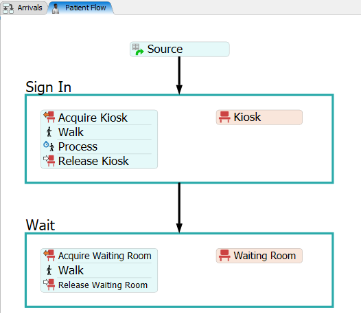 Patient Flowprocess flow. - Click the Patient Flow tab to open it. Notice that this process flow already has a Schedule Source activity. A token will be created in this activity whenever a patient is created by the Create Patient activity in the Arrivals flow.