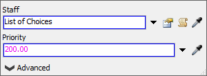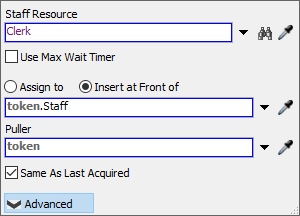 1. In the Phone Calls shape container, click the icon of the Clerk resource to open its properties. Click the arrow next to the Staff box to open a menu. Select Staff by List of Choices.