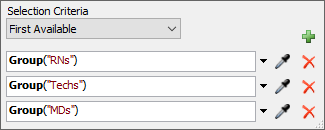 2. Click the plus button so you now have three rows. Click the arrow next to the first row, point to Staff Groups and then select RNs. Select Techs for the second row and MDs for the third.