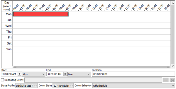 3. Click inside the Monday row near the 0:00 time slot and drag the cursor to the right to draw a box. Release the cursor at the 8:30 time slot. If needed, you can resize the box using the sizer handles at either end of the box.