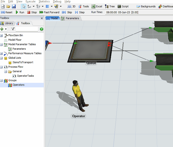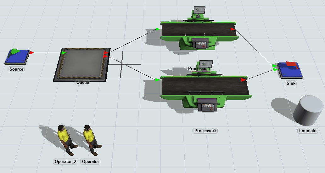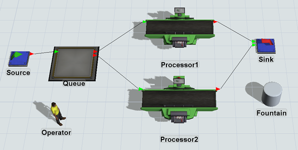 And it will control the two operators as they load flow items from a queue and unload them at one of two processors in the 3D model: