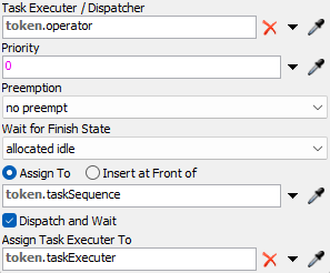 token.operator. - Click the Create Task Sequence activity to select it. In Properties, click the arrow next to the Executer / Task Sequence box to open a menu. Point to Token Label and select Operator. This will assign the task sequence we are creating to the operator previously acquired. Leave the other settings as their default values. You'll notice that this activity creates a new label on the token called taskSequence. All of the tasks in this sequence will be assigned to the sequence via this label.