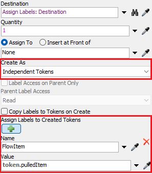 - Click the arrow next to the Item box to open a menu. Point to Token Label and select FlowItem. Click the arrow next to the Station box to open a menu. Point to Token Label and select itemDestination.