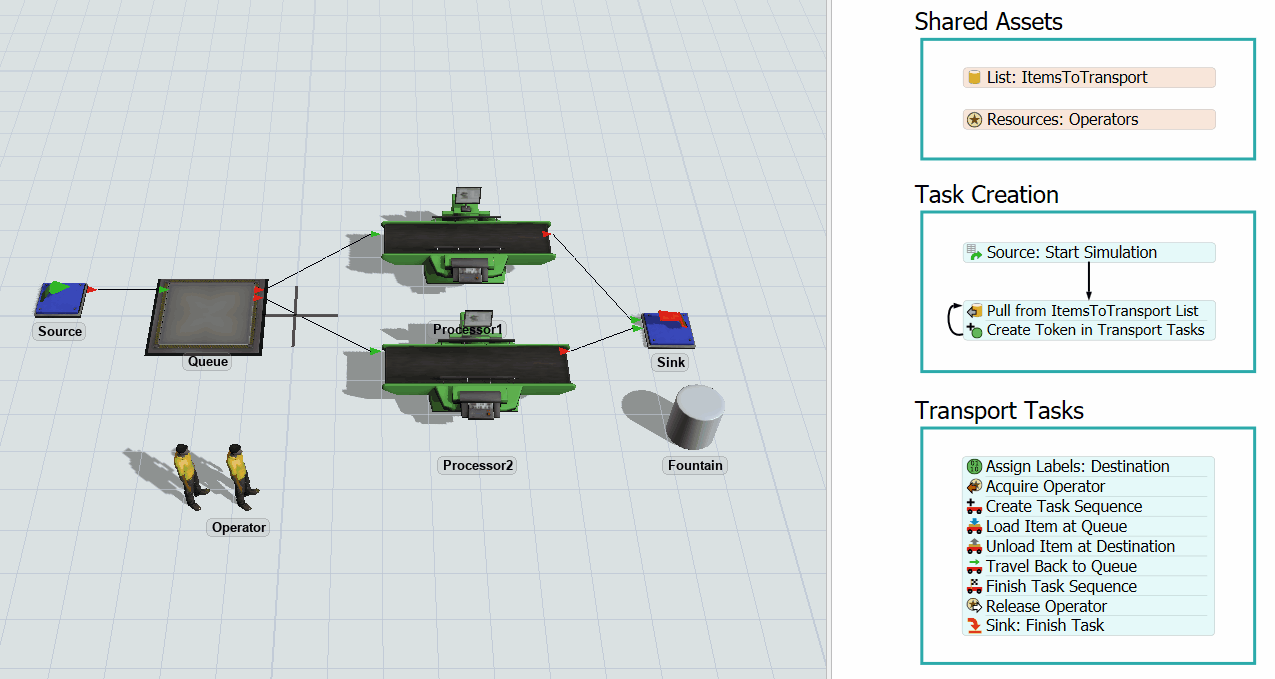 - Assign task sequences to an operator - When you acquire a resource in this process flow, you'll create a label on the token called operator that will link the resource to one of the two operators in the 3D model. After the operator has been assigned to a transportation task, this label will be used to dynamically assign this operator to complete all the tasks in the transportation task sequence.