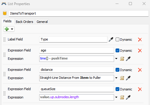 - Confirm that the List box displays the ItemsToTransport list is the currently selected list. Notice also that when the queue pushes the flow items to the list, it will create three labels on the item, as listed in the Store Data on Item box.