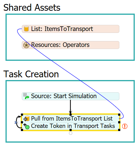 sampling mode. - Click the List: ItemsToTransport shared asset in the process flow to sample it. A blue line will appear to show that the list is now linked.