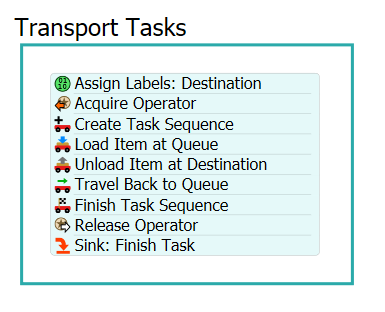 Activity New Name Assign Labels Assign Labels: Destination Acquire Acquire Operator Create TS Create Task Sequence Load Load Item at Queue Unload Unload Item at Destination Travel Travel Back to Queue Finish TS Finish Task Sequence Release Release Operator Sink Sink: Finish Task