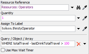 | Acquire: Get Thirsty Operator | This activity will check the resource's internal list for any operators who have traveled more than 100 meters since their last water break. When an operator on the list matches that criteria, it will acquire that operator. If an operator doesn't match that criteria, it will create a back order on the list. You'll create a label called thirstyOperator on the token to track which operator has been assigned to take a water break. |