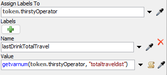 - lastDrinkTotalTravel - You'll add a field that creates a label on the operator called lastDrinkTotalTravel. This label will track the distance the operator has traveled since it took its last water break. The process flow will update this label after each operator takes a water break.