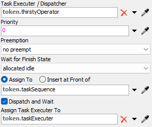 WHERE totalTravel - lastDrinkTotalTravel > 100. - Click the Create Task Sequence activity to select it. In Properties, click the arrow next to the Task Executer / Dispatcher box to open a menu. Point to Token Label and select thirstyOperator. This will assign the task sequence we are creating to the operator previously acquired. Leave the other settings as their default values. You'll notice that this activity creates a new label on the token called taskSequence. All of the tasks in this sequence will be assigned to the sequence via this label.
